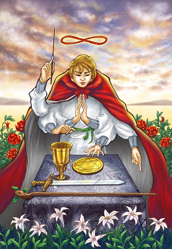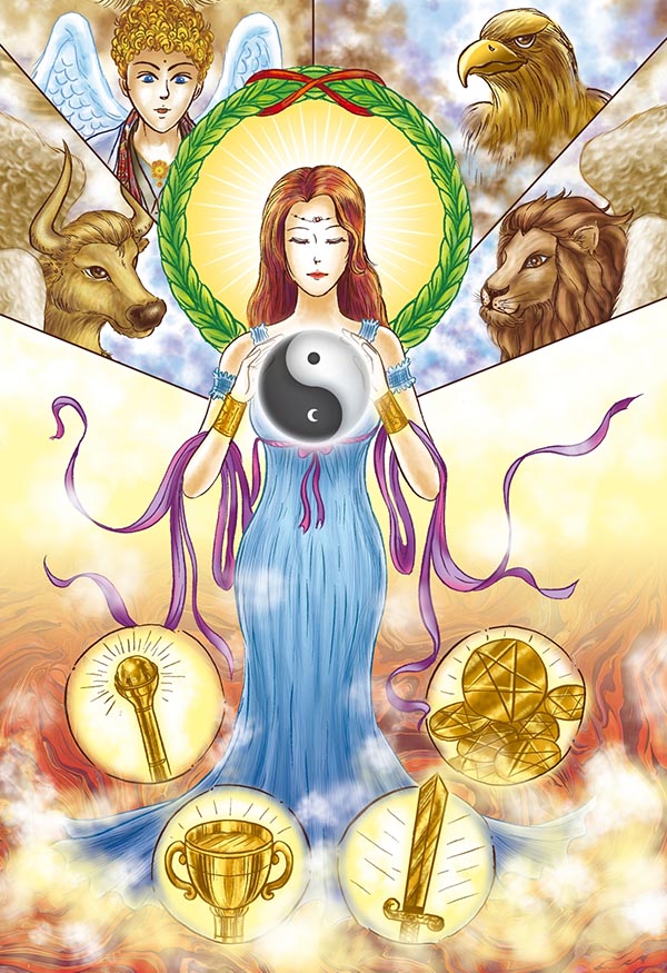 塔羅牌是神聖之光,創造出的一幅光之圖文形象,作為聖光的感應接引,在古老時代,是神聖的意象,是從「無」之中創造出來的「一」,透過宇宙四大元素:風、火、水、土,作為示現、教導。
